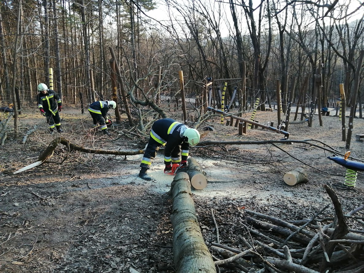 Szerencsére senkinek nem okozott sérülést, csak a játékok egy részének használatát akadályozta az a fa, ami az erdőből dőlt be az Erdei Macis Játszótérre. A játszótéren lévő gyerekek fegyelmezetten kivárták azt a 20 percet, amíg önkéntes tűzoltóink újra hozzáférhetővé tettek minden játékot.