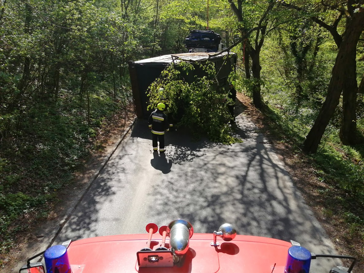 Egy lakókonténer volt a szállítmánya annak a teherautónak, ami a részére kiadott útvonalengedély alapján a Szép Juhászné úton Budakeszi irányába haladt délelőtt. Menet közben a szállítmány egy fában elakadt, és az úttestre zuhant. A helyszínre riasztott II. kerületi hivatásos, és egyesületünk önkéntes tűzoltói a leszakított faágat és a konténer sérült oldalfalait eltávolítták, majd a rakományt ezután a szállítójármű fel tudta venni. A műszaki mentés idejére a Szép Juhászné út lezárásra került. Személyi sérülés nem történt.